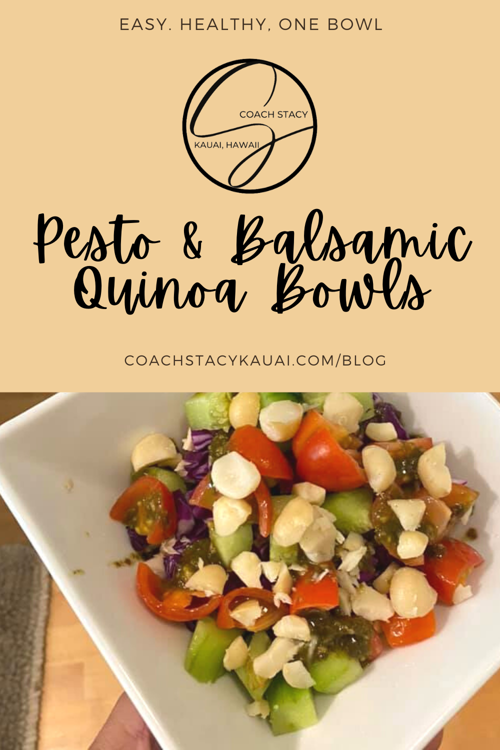 Chop up the following & add on top: cucumber, tomato, red cabbage, & a whole lotta macadamia nuts for a garnish.