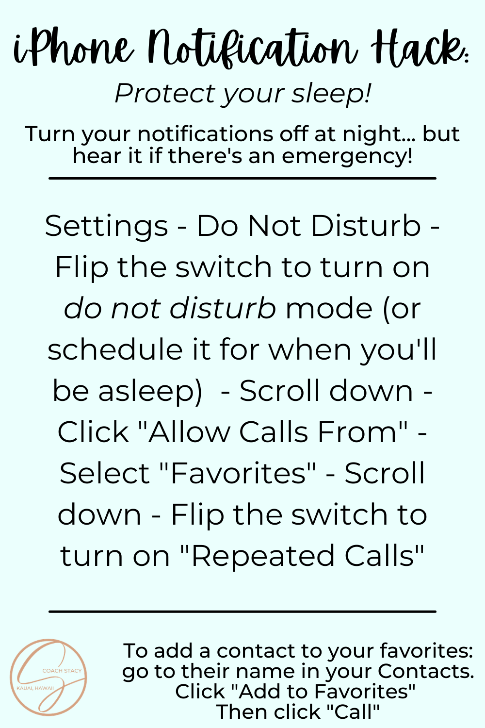 It’s really important that your notifications are turned off so you can have uninterrupted sleep! You can set up your phone so calls only come through if certain people call you more than once in a row. For example, if my daughter calls me once, I won’t hear it. If she calls me twice, it comes through!